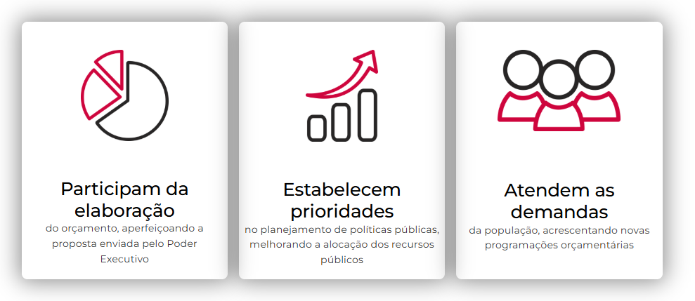 Por meio da apresentação de emendas individuais impositivas à Lei Orçamentária Anual (LOA) os Deputados estaduais definem prioridades no âmbito do planejamento de políticas públicas e podem indicar órgãos/entidades da Administração Pública Estadual, Federal ou Municipal e organizações da sociedade civil para receber recursos orçamentários.